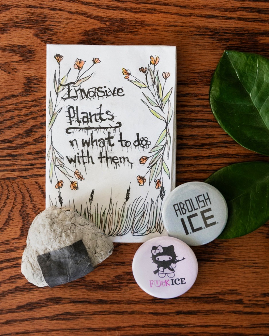 Fuck I.C.E. button and Invasive Plants Zine by The Sisters Show