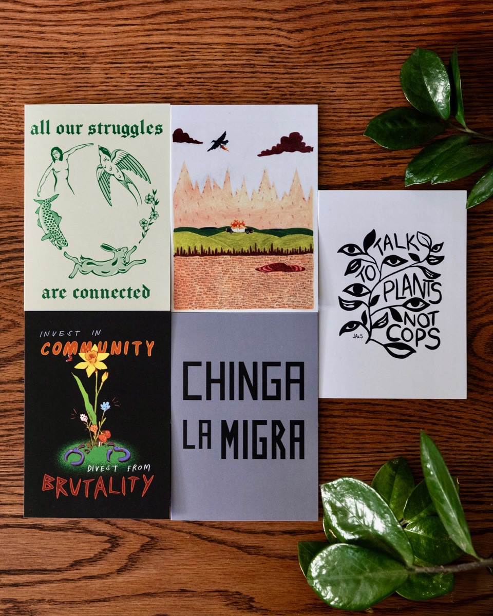 5 pack greeting cards with envelopesSend your friends messages of solidarity and mutual care featuring original art from JAS’s collection, representing the daily work and timeless values of Mutual Aid.