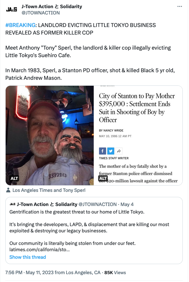 We must stop killer cop and slumlord heir, Anthony Sperl’s scheme to warp Little Tokyo into “something that resembles Melrose.”